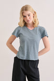 The Basic Tee is a fresh take on a Kuwaii classic—designed with subtle charm and effortless wearability in mind. Made from a cotton, viscose, and linen knit stripe, this style offers a breathable, lightweight feel with just the right amount of structure. Its gently flounced short sleeve adds a soft, feminine detail, elevating a timeless silhouette that’s perfect for layering or wearing on its own. An elegant addition to any considered wardrobe, the Basic Tee is a refined staple that seamlessly transitions from day to night.