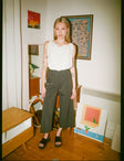 The Wide Leg Tailored Pant, introduced in 2018, is the second iteration of our classic pant. This style is designed with a perfect cropped length to showcase a statement shoe. It tends to fit slightly larger than the original Tailored Pant, making it a great option for those between sizes. Crafted from a lightweight Cotton Blend with a subtle pinstripe, these pants are divinely stretchy making for the perfect summer pant to wear all day long.
